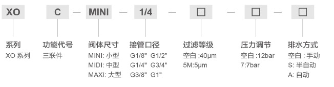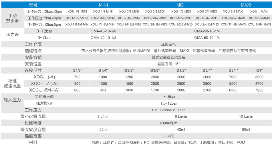 XOC型二聯(lián)件由一個(gè)XOF型過濾器,-一個(gè)XOR減壓閥和一個(gè)XOL型油霧器組成,這些元件可以分別訂購,分水過濾器能過濾空氣中的液態(tài)油、冷凝水及雜質(zhì),對(duì)于特殊應(yīng)用場(chǎng)合,5μm濾芯容易替換40μm的標(biāo)準(zhǔn)濾芯。即使輸入壓力與壓縮空氣消耗產(chǎn)生系統(tǒng)波動(dòng),減壓閥也能保證其設(shè)定的工作壓力非常穩(wěn)定。