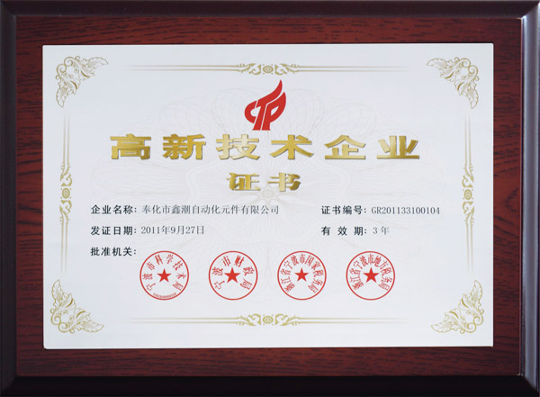 鑫潮氣動公司 被寧波多家政府機(jī)關(guān) 授予“國家高新技術(shù)企業(yè)”稱號。